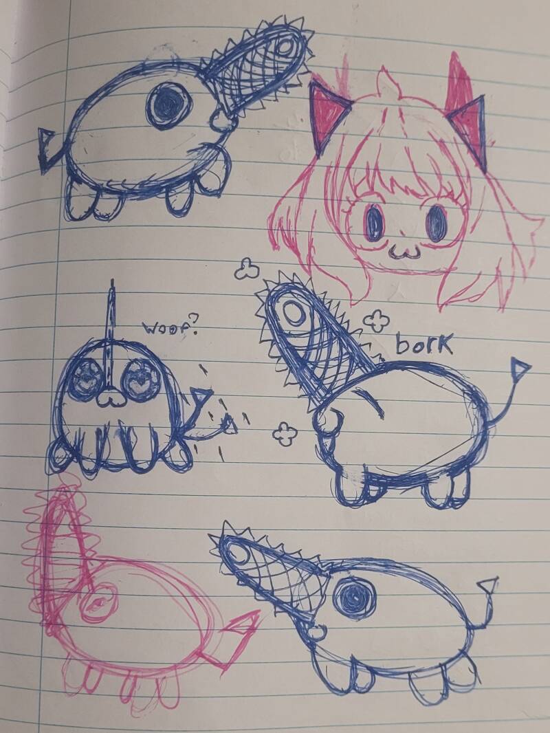 Chainsaw puppy and miss Anya (my friend drew the pink chainsaw dog thing lmao)